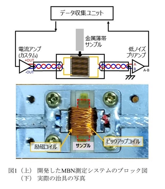 東京理科大学 研究推進機構 総合研究院の山崎 貴大助教、同大学 先進工学部 マテリアル創成工学科の小嗣 真人教授、産業技術総合研究所の田丸 慎吾主任研究員らの共同研究グループは、Fe-Si-B-P-Cu系アモルファス/ナノ結晶合金リボン(NANOMET(R))を対象に、独自開発した広帯域・高感度な磁気バルクハウゼンノイズ(MBN)測定システム(図1)を用いて、金属材料内部で発生するMBN信号を単一パルスとして捉えることに成功しました。さらに、その減衰過程を解析することで、磁壁の動きとエネルギー損失との直接的な関係を実験的に実証しました。