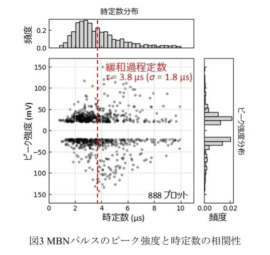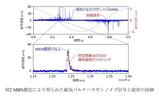 MBNパルスの減衰過程に着目した統計解析により、緩和時定数(*3)の平均が3.8 μsであることを明らかにし、材料中の構造やピン止めサイト(*4)がエネルギー散逸に及ぼす影響を定量的に評価しました。