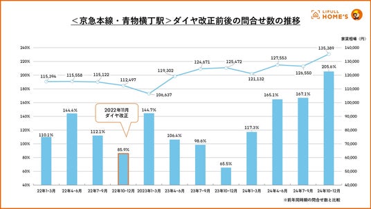 両駅周辺の賃貸物件への問合せ数は、「青物横丁」ではダイヤ改正時の2022年10-12月は前年同月比85.9%でしたが、改正後の2023年1-3月には同144.7%に、「平和島」では改正時が同104.8%でしたが、改正後は同130.2%に、それぞれダイヤ改正を境に問合せ数が前年から大きく伸長しています。