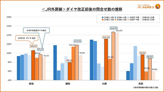 JR内房線の各駅のうち、一定以上の問合せがあった「蘇我」「浜野」「八幡宿」「五井」「姉ヶ崎」「木更津」周辺の賃貸物件への問合せ数は、ダイヤ改正直後の2024年4-6月に「蘇我」で前年同期比89.6%、「浜野」で同67.2%、「八幡宿」で同88.0%、「五井」で同89.1%、「姉ヶ崎」で同97.8%、「木更津」で同87.9%と、全6駅で前年より減少しました。