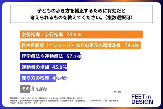 調査の最後、「子どもの歩き方を補正するために有効だと考えられるもの」を問う設問の回答では、1位が「姿勢指導・歩行指導」で75.8%、2位が「靴や足底板などの足元の環境改善」で74.3%、3位が「理学療法や運動療法」で57.7%という結果になりました。また4位以降も、回答率40%を超える回答が複数続く形となり、子どもの歩き方を補正するために有効だと考えられるものは様々あることが、この結果からわかりました。