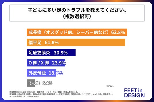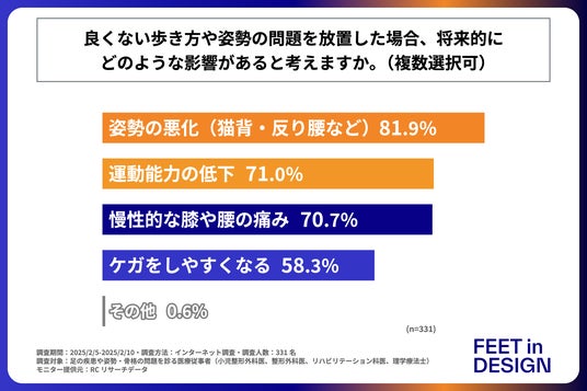 株式会社フィートインデザイン(本社:東京都中央区、代表取締役:久保田 敦)が提供する「ORTHOTICS(オーソティクス)」は、足の疾患や姿勢・骨格の問題を診る医療従事者を対象に「子どもの足の健康と身体への影響に関する調査」を実施しました。この調査結果から子どもの足の健康とそれが身体に与える影響などが明らかになりました。