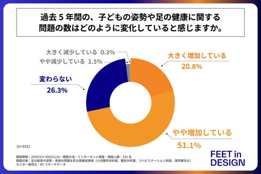 足の疾患や姿勢・骨格の問題を診る医療従事者の7割以上が、子どもの姿勢や足の健康に関する問題の数は直近5年間で増加していると感じている