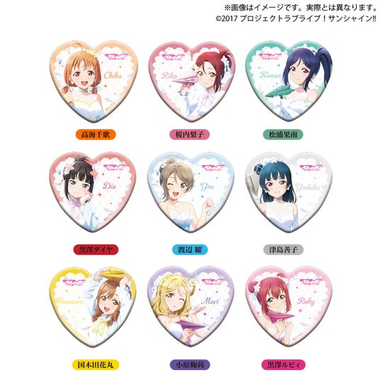 「Aqours」メンバー9名の描き下ろしイラストを使用したハート型缶バッジ。