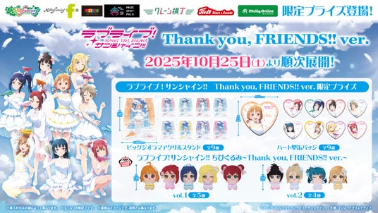 株式会社イオンファンタジー(本社:千葉県千葉市、代表取締役社長:藤原徳也、以下、当社)は、『ラブライブ!サンシャイン!!』の描き下ろしイラストを使用した「ラブライブ!サンシャイン!! Thank you, FRIENDS!! ver.」の限定プライズゲーム用景品を2025年10月25日(土)より、全国の「モーリーファンタジー」「PALO」、オンラインクレーンゲーム「モーリーオンライン」にて順次展開いたします。