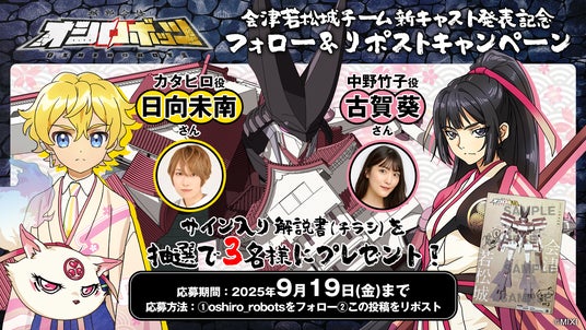 株式会社MIXI(東京都渋谷区、代表取締役社長 上級執行役員 CEO:木村 弘毅)は、MIXI_ANIMEオリジナルコンテンツ『城郭合体オシロボッツ』において、オシロボット会津若松城パイロット「カタヒロ」のCV・日向未南さん、シロダマ(武将)「中野竹子」のCV・古賀葵さんを公開しました。また、新たにセリフを加え、一部カットを再撮影した準新作映像も同時公開しました。このキャスト発表を記念して、サイン入り解説書(チラシ)が抽選で当たるキャンペーンも実施します。今後も各オシロボットのパイロットおよびシロダマ(武将)のCVを順次追加していく予定です。
