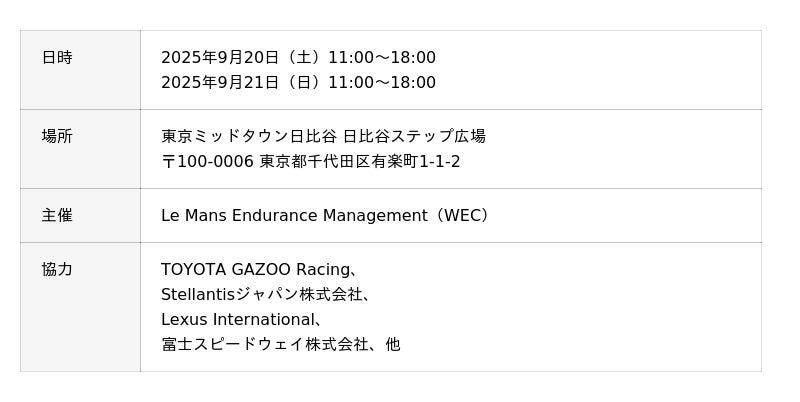 FIA世界耐久選手権(WEC)の運営組織Le Mans Endurance Managementは、2025年9月20日(土)および21日(日)の2日間、東京・日比谷のランドマーク東京ミッドタウン日比谷 日比谷ステップ広場にて、『WEC JAPAN SHOWCASE IN TOKYO HIBIYA』を開催いたします。
