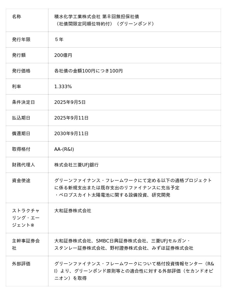 積水化学工業株式会社(代表取締役社長:加藤 敬太、以下「積水化学」)は、サステナブルな社会の実現に向けた取り組みを加速するため、サステナビリティ貢献製品の提供を強化するとともに、同取り組みについて幅広くステークホルダーの皆さまに周知し、資金調達面からも推進することを見据え、積水化学初のグリーンボンド(以下「本社債」)の発行条件を本日決定いたしました。詳細は下記の通りです。