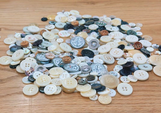 ものづくりの過程で出た残布・残糸や、リコットンとして回収した製品から仕分けた、貝、ナッツなどの天然素材ボタンの量り売り。