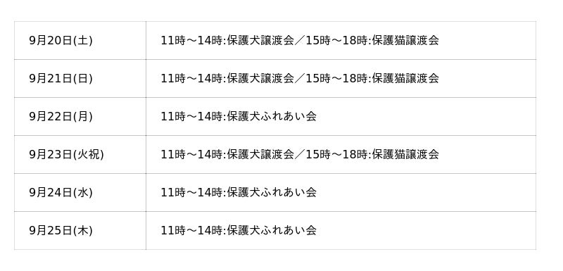 1.保護犬猫の譲渡会・ふれあい会関東譲渡センターにいるワンコたちと、ピースニャンコが支援している団体さんのニャンコたちに来てもらい、譲渡会やふれあい会をおこないます。(※「保護犬ふれあい会」では譲渡はおこないません)