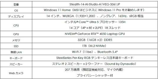 ・Stealth-14-AI-Studio-A1VEG-5061JP販売ページ:https://jpstore.msi.com/shopdetail/000000000957