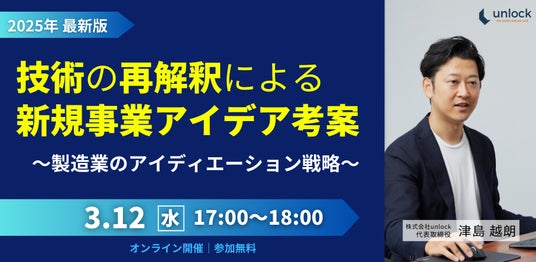 株式会社unlock(東京都渋谷区、代表:津島越朗)は、2025年3月に「自社技術を活用して新規事業を生み出す方法やそのハードル」に関するアンケート調査を実施しました。その結果、新規事業を検討する企業の9割が「自社技術と親和性の高い分野」を対象としている一方で、4割以上が「これまでと関係がない分野」にも関心を持つことが明らかになりました。