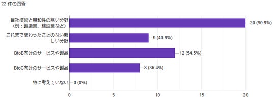 また、9割の企業が既存技術と親和性の高い領域での新規事業開発を検討している一方で、4割が異業種展開も視野に入れており、事業ポートフォリオの多角化に向けた動きも見受けられます。