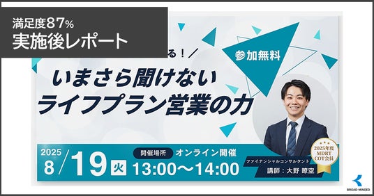 「金融の力を解き放つ」をパーパスに掲げ、ライフプラン実現を支援する金融サービスの開発・提供を手掛けるブロードマインド株式会社(本社:東京都渋谷区、代表取締役社長:伊藤清、証券コード:7343、以下「当社」)は、8月19日(火)、株式会社タックナビが運営するお金の専門家とユーザーのマッチングサービス「まねぽん」登録のファイナンシャルプランナー(FP)を対象としたオンラインセミナー「いまさら聞けない ライフプラン営業の力」を実施いたしました。