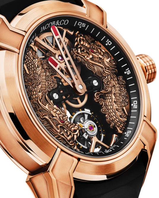18Kローズゴールドの温もりと繊細な細工が融合し、モダンなスケルトンの透明感と神話的な荘厳さが調和。その姿は「時を刻む存在」でありながら「文化を語る存在」として、人々を魅了します。