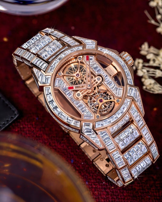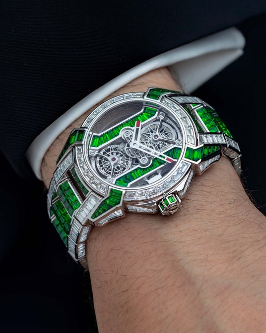 時計でありながらジュエリーでもあるという二重の性格は、ジェイコブ&コーが打ち立ててきた「常識の枠を超える美」の象徴そのもの。手にする人に圧倒的な高揚感を与え、見る人に忘れがたい印象を残すこのモデルは、ラグジュアリーの極致として存在感を放ちます。