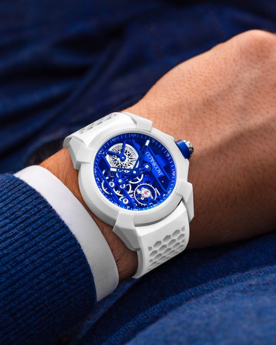 ケースに収められるのは、スケルトン仕様のジェイコブ&コー専用ムーブメント。ホワイトセラミックには鮮やかなメタリックブルーが、ブラックセラミックにはゴールドが映え、素材の質感とカラーコントラストが見事に融合しています。単なる素材の違いにとどまらず、存在感そのものを際立たせる仕上がりとなっています。