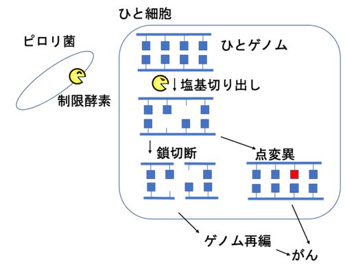 発見されたピロリ菌が胃がんを起こす新しいしくみ。ピロリ菌が作る制限酵素(DNAを切るハサミ)が,ひとの胃の細胞に入りこみ,ゲノムDNAの特定の場所で塩基を切り出して,点変異と切断によるゲノム再編を起こす。それらが胃がんを起こす。