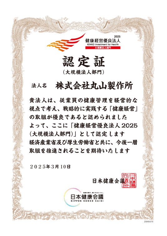 株式会社丸山製作所(本社:東京都千代田区、代表取締役社長:内山剛治)および当社グループ会社である日本クライス株式会社、マルヤマエクセル株式会社、西部丸山株式会社、丸山物流株式会社は、経済産業省と日本健康会議による「健康経営優良法人認定制度」において、4年連続で「健康経営優良法人(大規模法人部門)」に認定されました。