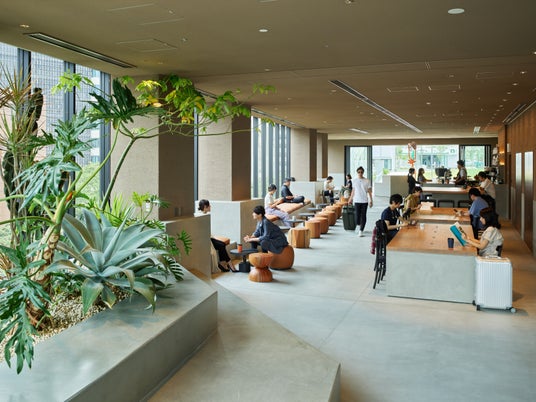 ・屋外とつながる開放的なカフェやレストラン、共用空間