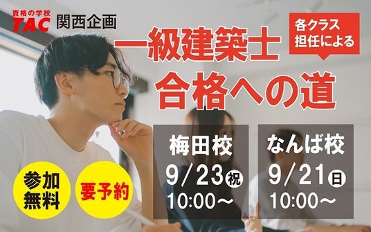 簿記検定試験、税理士、公認会計士などの資格取得に向けた教育サービスを展開しているTAC株式会社(東京都千代田区、代表取締役:多田 敏男)は、2025年9月21日(日) と9月23日(祝・火)に梅田校・なんば校担任による一級建築士 合格への道を開催します。