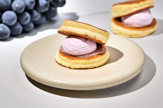 伝統製法の本みりんを贅沢に使用したしっとり、ふわふわの生地の中に、巨峰の果汁を合わせたクリーム、巨峰とブルーベリーのゼリーを挟みました。