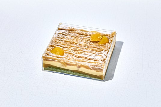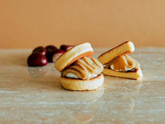 深い甘みと複雑な旨みを持つ本みりんを使用し、銅板でじっくりと焼き上げたどら焼きの中は4層仕立てにしています。コロンビア産の華やかな香りを持つビターチョコレートと北海道産の粒あんを合わせた自家製のチョコあんに、カカオのフルーツビネガーを加えたさわやかな生クリームを絞りました。そこに小布施の和栗の甘露煮を乗せ、上にはなめらかな栗あんを絞ったモンブラン仕立ての生どら焼きです。