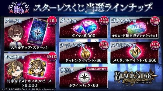 6周年イベント期間中に無料10連ガチャの結果をSNSでシェアすると、「スターレスくじ」がもらえます。当選番号は6周年イベント終了後に発表されます。