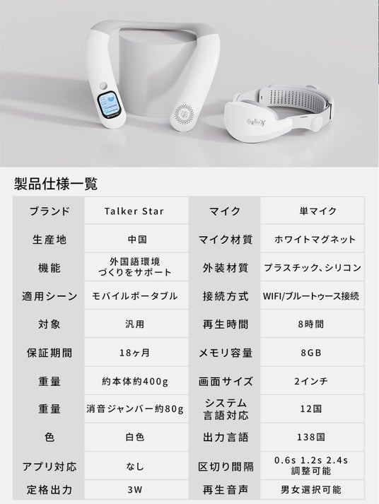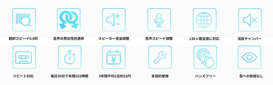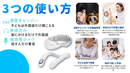 首にかけるだけで、入力・出力言語を設定するだけ。手を自由に使えるため、家事や遊び中でも学習可能です。