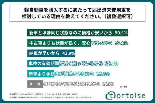 調査の最後、「軽自動車の購入を届出済み未使用車で検討している」と回答された方に、「軽自動車を購入するにあたって届出済み未使用車を検討している理由」を尋ねる設問への回答では、1位が「新車とほぼ同じ状態なのに価格が安いから」で90.5%、2位が「中古車よりも状態が良く、安心できるから」で57.1%、3位が「納車が早いから」で42.9%となりました。ここでは新車と中古車双方のメリットを両立するような理由が上位に並ぶ結果となりました。