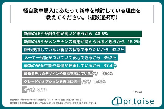 続いて、「軽自動車の購入を新車で検討している」と回答された方に「軽自動車購入にあたって新車を検討している理由」を尋ねる設問では、1位が「新車のほうが耐久性が高いと思うから」で48.8%、2位が「新車のほうがメンテナンス費用が抑えられると思うから」で48.2%、3位が「誰も使用していない新品の状態で乗りたいから」で42.2%という結果になりました。また、4位以降も回答率30%を超える回答が複数並ぶ形となり、軽自動車を新車で購入したいと考える理由は多岐に渡ることがわかりました。