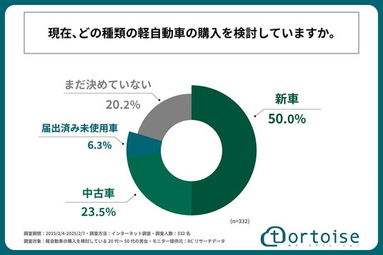 次に、「現在、どの種類の軽自動車の購入を検討しているか」を問う設問への回答で最も多かったのは1位が「新車」で50.0%、次いで2位が「中古車」で23.5%、3位が「まだ決めていない」で20.2%という結果になりました。この結果から、軽自動車を「新車」で購入することを検討している人の割合は50%であることが判明しました。
