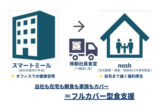 スマートミールとnoshを組み合わせれば、出社・在宅・家族利用までをカバーする“移動社員食堂”が実現します。