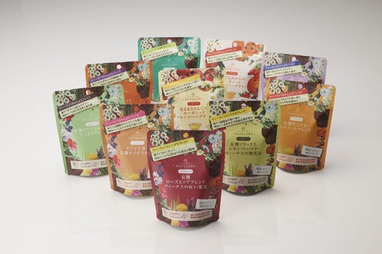 本方式は、株式会社大和のオーガニックティーブランド「なごみナチュルア」に採用されました。紙外層への切り替えでプラスチック使用量を37%削減。10種類のデザインを各1,000袋単位で製造するなど、多品種小ロットでの展開を実現しています。