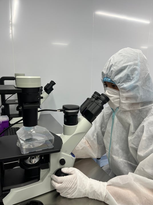 位相差顕微鏡とモニターを使い、細胞の培養・観察を行う細胞培養加工士