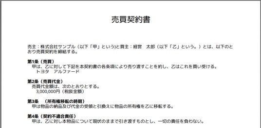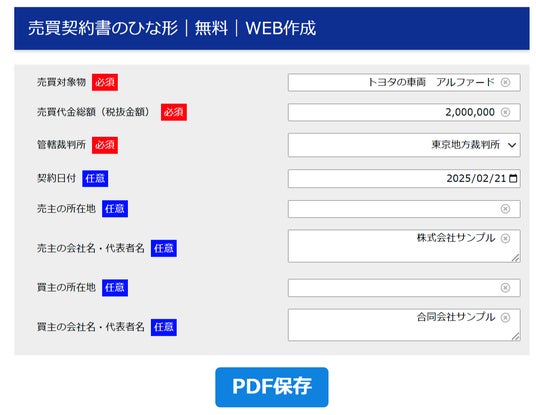 そこで、売買契約書の作成に手間をかけず作成するため、無料で利用できる雛形を公開しました。パソコンやスマートフォンから必要な事項を入力するだけで、専門知識なしに十分な売買契約書を作成できます。