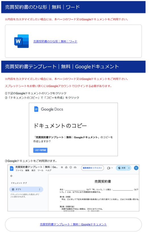 また、売買契約書の内容をカスタマイズしたい方へ向けて、WordファイルとGoogleドキュメント形式の雛形およびテンプレートをご準備しています。こちらも無料でダウンロードやコピーが可能であるため、オンラインフォームの内容だけで不足する場合などは、ご利用ください。
