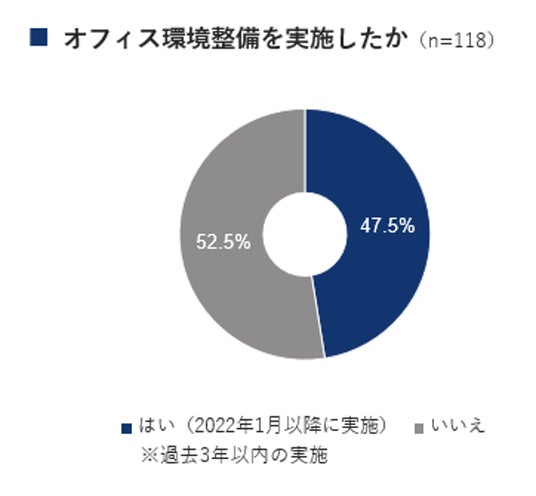 近年、オフィス空間は、デジタル技術の進展に処理デジタル基盤やセキュリティ環境の整備は欠かせなくなり、また、働き方改革の推進により、業種の枠を超えて、いつでもどこでも働ける環境の整備が注目され、多様化が進んでいます。「働く場」だけではなくなりつつあるオフィスの環境整備を実施したかという問いに対し、47.5%の企業が「実施した」との回答が得られました。
