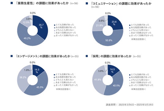 実施した企業の目的として最も多かったのは「業務生産性を向上させるため」(66.1%)、次いで「エンゲージメントを高めるため」(28.6%)との結果となり、全体として業務生産性向上への期待が大きいことがわかりました。