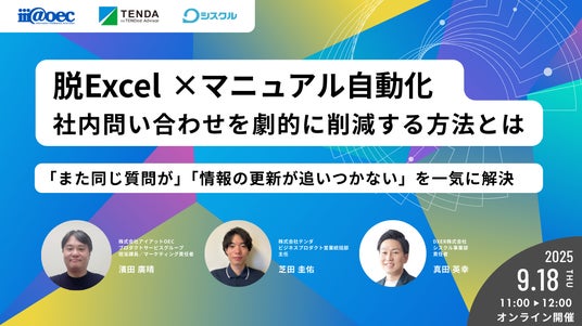 マニュアルトータルソリューションを軸に「ホワイトカラーの業務効率化」を推進する株式会社テンダ(本社/東京都渋谷区、代表取締役会長兼社長CEO/薗部 晃、以下「テンダ」)は、3社共催ウェビナー『脱Excel×マニュアル自動化~社内問い合わせを劇的に削減する方法とは~』を2025年9月18日(木)に開催いたします。