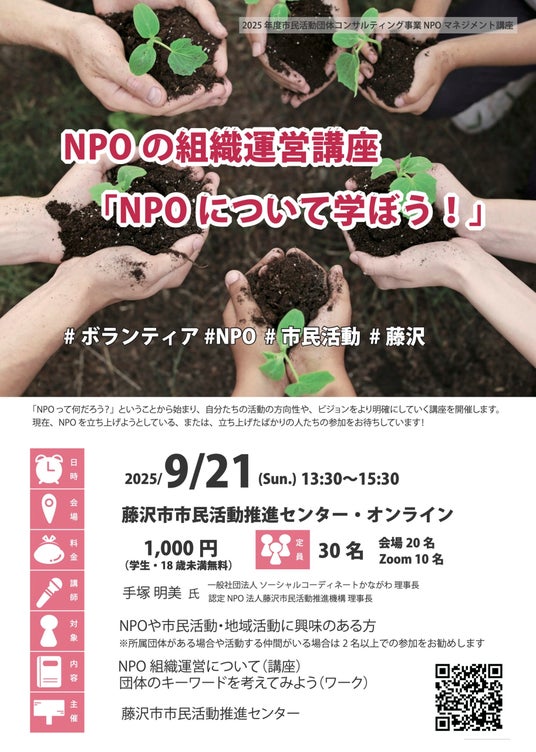 藤沢市市民活動推進センターは、マネジメント講座NPOの組織運営講座「NPOについて学ぼう!」を9/21(日)に開催します。このイベントは、団体の大事にしている思いなどを考えることで、自分たちの活動の方向性やビジョンをより明確にすることをテーマに、NPOや市民活動・地域活動に興味のある方を対象にしたものです。私たちは、マネジメント講座を通じて、NPOや市民活動の活性化を目指しています。