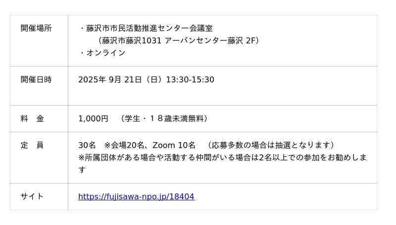 - 参加申込方法:Peatix藤沢市市民活動推進センター(メール:f-npoc@shonanfujisawa.com、電話:0466-54-4510、FAX:0466-54-4516)