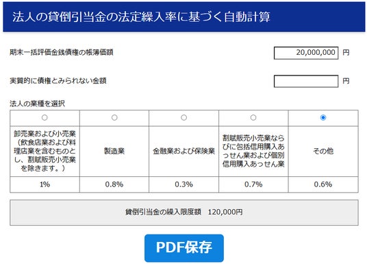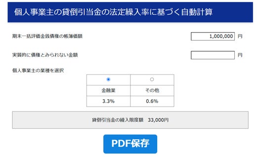 「貸倒引当金の法定繰入率・繰入限度額の自動計算ツール」は、貸倒引当金の繰入限度額を算出できるツールです。必要な事項を入力するだけで自動的に計算されるため、専門的な知識は必要ありません。パソコンのみならず、スマートフォンやタブレットからも利用可能で、計算した結果はPDFで保存できます。