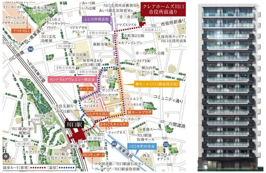 「クレアホームズ川口 市役所前通り」は、2025年11月築となっており、15階建て新築分譲物件です。「アリオ川口」や「ららテラス」などの商業施設、「川口市役所」といった行政機能、そして緑豊かな公園などが生活圏にあり、暮らしの利便と心地よさを兼ね備えたロケーションです。