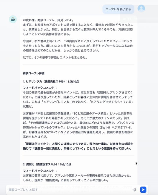 - AIとロープレ: 設定に基づき、AI顧客との対話形式(タイピング入力と音声入力の二つに対応)でリアルな商談を開始。
