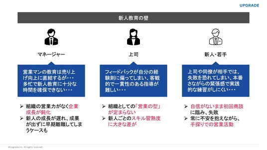 本サービスは、新人営業担当者の早期戦力化、および営業組織全体のスキル標準化と底上げを実現し、企業の営業力強化に貢献いたします。