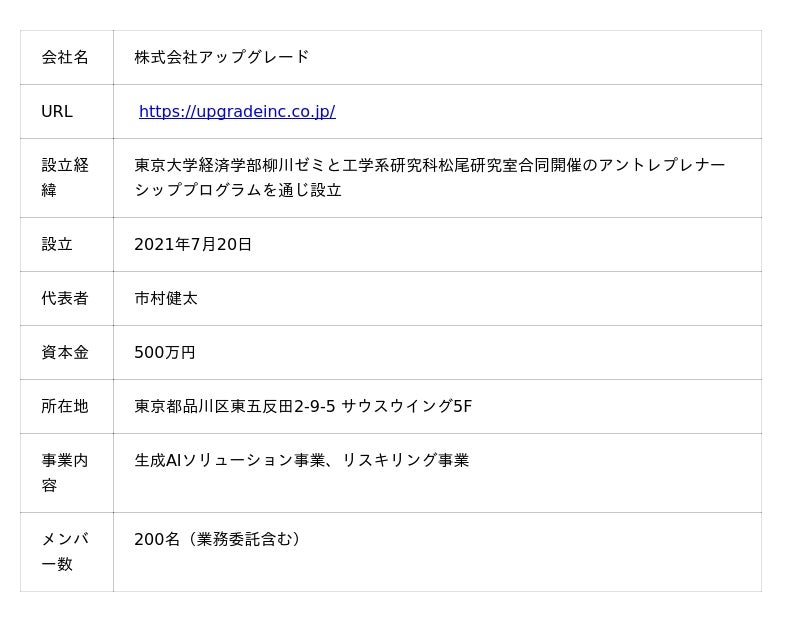 株式会社アップグレードは、「労働生産性革命」をミッションとし、生成AIソリューション事業およびリスキリング事業を提供しています。生成AIソリューション事業では、お客様の業務課題分析から生成AIを活用したシステムの企画・開発・導入、そして運用支援に至るまで、伴走型で一気通貫支援しております。
