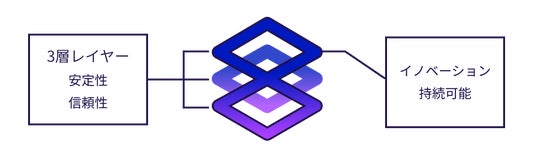 3層に重なるレイヤーは、「私たちのテクノロジーで変革を導く、揺るがぬ信頼でお客様のDXを支える、進化し続けながら安定した未来を築く」という私たちの使命を表しています。
