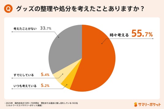 また、「グッズの手放しや整理を考えたことがあるか」という問いには、「時々考える」(55.7%)が最多で、「いつも考えている」(5.2%)と合わせると全体の6割以上が整理や処分を意識している実態が明らかになりました。背景には、大量のグッズ所有による負担感や収納スペースへの関心の高まりがあると考えられます。