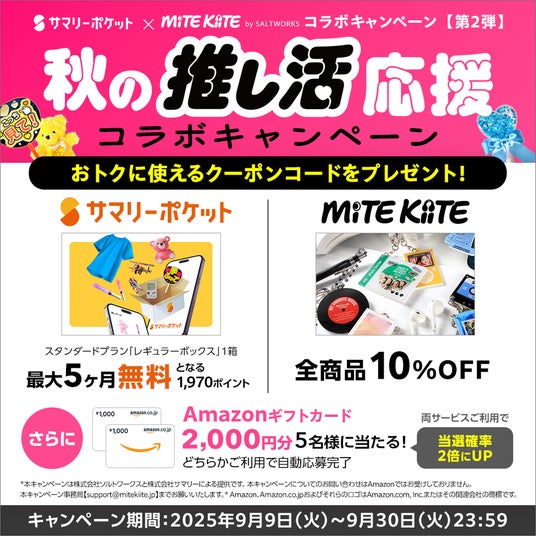 ご注文時にクーポンコードを入力いただくと、「サマリーポケット」「MiTE KiiTE」をおトクにご利用いただけます。さらに、クーポンをご利用いただいた方の中から抽選でギフト券が当たるWチャンスも実施しています。